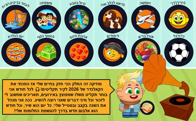 הקאלנדר שלי ל2026 מעוצב כאוסף תקליטים אישי. כל תקליט מייצג חודש אחר בשנה, ובו מופיעים התאריכים והיעדים הכי חשובים שלי. בחרתי במוזיקה כי היא הקצב שמניע אותי קדימה, וכל חודש הוא אלבום חדש בדרך להגשמת החלומות!