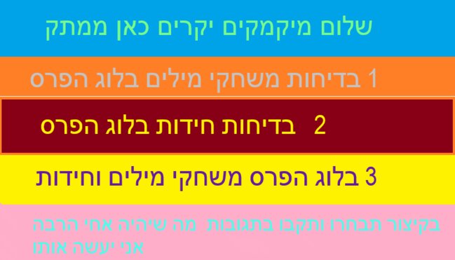 שלום מיקמקים אני ממתק ואני פתחתי קהילה אז בקיצור יש שאלון מה אתם רוצים שיהיה בקהילה תבחרו מספר ומה שיהיה הכי הרבה זה התוכן שאני יעשה