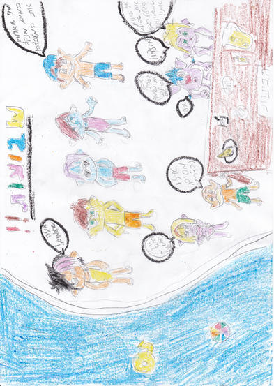 ציור של החבורה בבריכה עם ראש העיר מיקיאוולי ומונדו אלקסיס ורייני