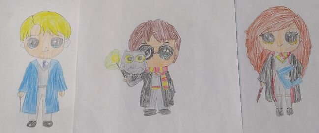 היי אריאלים ואריאלות יקרים ויקרות בשנייה האחרונה אני עושה עיצובים אז בואו אני יציג לך את הפריטים. הרמיוני הבת: 1. שיער חום ארוך מדליק 2. ג'קט שחור 3. מקל קסמים 4. ספר כשפים 5. נעליי בלט שחורות 6. סימלה אפורה הארי פוטר: 1. שיער קצר חום 2. צעיף אדום צהוב מהמם 3 משקפיים עגולות שחורות 4. חולצה ומכנס אפורים 5. ינשוף על הכתף 6. שרביט זוהר רון ויזלי: 1.שיער צהוב בהיר 2. עניבה כחולה 3. ג'קט כחול ארוך 4.נעליים שחורות וזה היה הלוקים... מקווה לזכות!!!