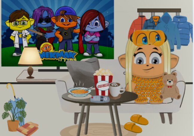 ועכשיו נעבור ליצירה: ביצירה רואים דמות, המיקמק שלי לבוש בפיגמה חורפית ונעימה עם ההדפס הכי כיף שאפשר ללבוש על פיגמה ועוד עם כיסוי עיניים!! מחזיקה דובי וצופה בסדרה מיקמק, לצידה יש שולחן עם שוקו חםם {איך התגעגעתי לשוקו חםם} פופקורן, ומרק חם וטעים. רציתי להוסיף גם קרבו אבל לא הצלחתי... אזז כןן זאת הייתה היצירה שלי לבלוג... תכתבו אם אהבתם ומה אתם חושבים על הרעיון של לקחת הפסקה...