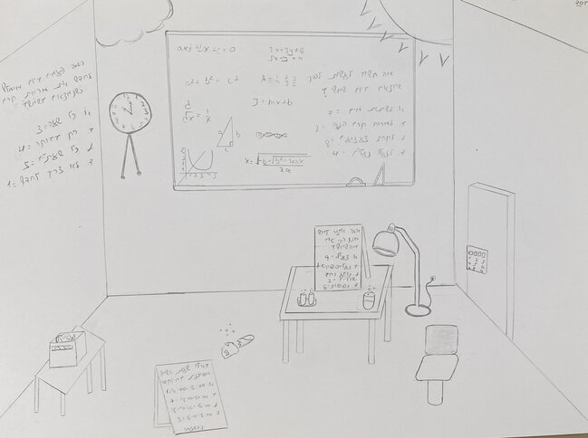 את החדר בריחה עיצבתי בסגנון מעבדה לדוג': לוח ובו מלא חישובים , מנורה חמודה ליד שולחן שעליו מונחות מבחנות ו... אופס! נשברה לי מבחנה אחת שנפלה על הרצפה...