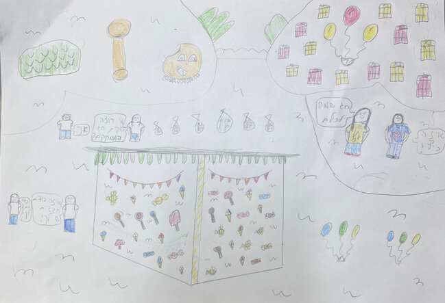 הי מיקימושים!! החלטתי לצייר בפעם השנייה לבלוג הפרס והנושא הפעם הואאאא!? ״המתנה המושלמת לשנה החדשה!״ אז ציירתי מתנה בצורת סוכה עם מלאאאא ממתקים במגוון צבעים והמקום בו שציירתי זה בגבעה של מיקמק2 ציירתי אנשים מדברים אחד עם השניה מלאאאא מתנות קטנות בצבעים אדום וצהוב מלא מלא מלא בלונים בצבע צהוב אדום כחול וירוק