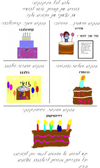 פרדי31 אנא כתבי לי בתגובות מתי את יכולה להיפגש לעיצוב (אני פנוייה בימים שלישי חמישי שישי ושבת). קדורגל1 אנא כתוב לי בתגובות מתי אתה יכול להיפגש לציור (אני פנוייה בימים שלישי חמישי שישי ושבת). גיל553 אנא כתוב לי בתגובות מתי נוכל להיפגש לשעה (פנוייה בימים שלישי חמישי שישי שבת ושמי יעל1253). דידיהמיקמק אנא תכתבי לי מתי נוכל להיפגש לחצי שעה שלושים דקות(פנוייה בימים שלישי חמישי שישי שבת ושמי יעל12539. כל הכבוד לכולם! וגם כל הכבוד לכולם שניסו לנצח!