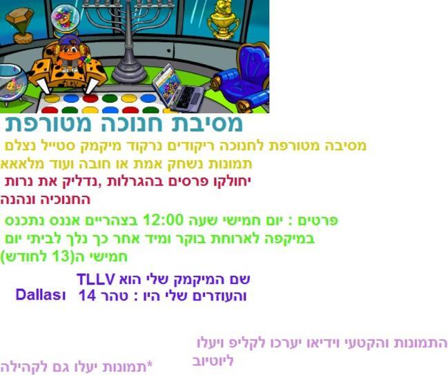 יום חמישי ה13 באננס נתאסף לארוחת בוקר במיקפה בשעה 12:00 בצהריים \ בוקר ומשם לבית של TLLV נשחק משחקים נעבור משימות וחידונים יוגרלו פרסים נדליק ונשיר סביב החנוכייה נצטלם ונעשה שמח