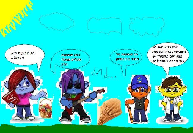 בציור הזה גימבו, סאני, זואי ומקס חוגגים את חג שבועות. הם אפילו אומרים כמה עובדות על חג השבועות.