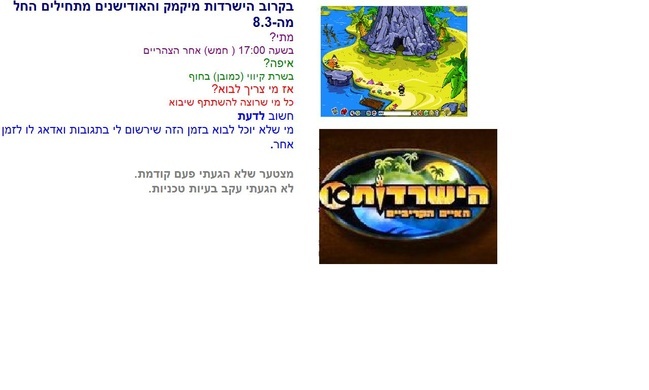 מענה לתגובה של דולי900: זה בחוף ופירסמי תמונה של האי כי ההישרדות עצמה תיהיה באי. זה רק האדישנים. |