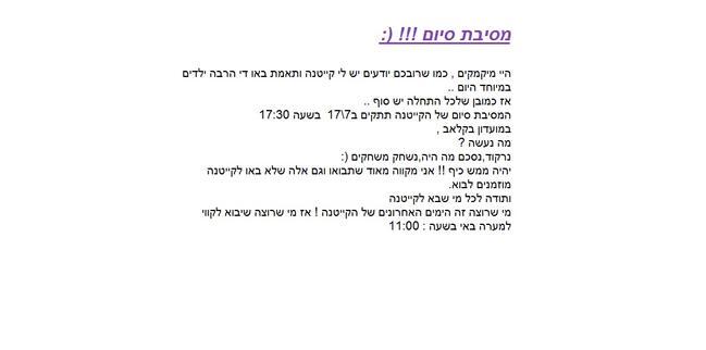 היי מיקמקים , כמו שרובכם יודעים יש לי קייטנה ותאמת באו די הרבה ילדים במיוחד היום .. אז כמובן שלכל התחלה יש סוף .. המסיבת סיום של הקייטנה תתקים ב7\17 בשעה 17:30 במועדון בקלאב , מה נעשה ? נרקוד,נסכם מה היה,נשחק משחקים (: יהיה ממש כיף !! אני מקווה מאוד שתבואו וגם אלה שלא באו לקייטנה מוזמנים לבוא. ותודה לכל מי שבא לקייטנה מי שרוצה זה הימים האחרונים של הקייטנה ! אז מי שרוצה שיבוא לקווי למערה באי בשעה : 11:00 |