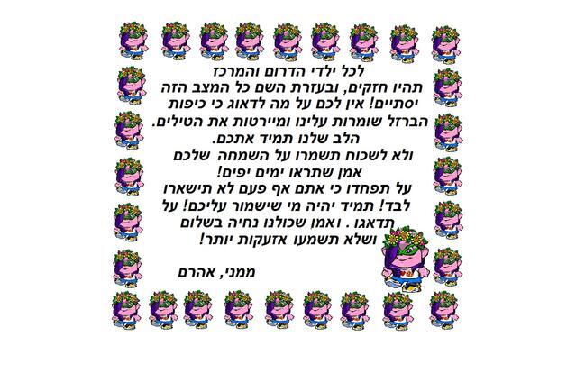 תודה רבה מקווה שהגמר מהר אני ברמת גן דרך אגב גם אני שלחתי לילדי הדרו ציור תודה רבה רבה |