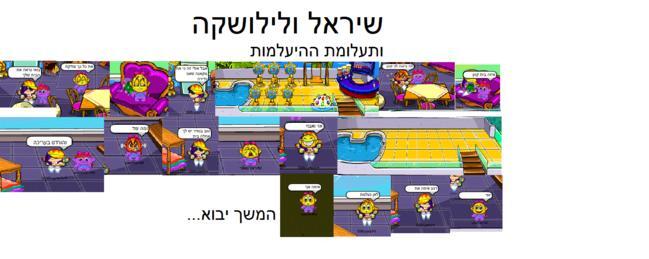 מיק במאי: כשחשבנו על הקומיקס בין לילושקה לבין שיראל לא ממש ידענו מה לעשות.. לילושקה הציעה שנעשה קומיקס על העדרויות מיקמקים והסכמנו. התחלנו לצלם והבנות ממש אהבו את זה כאילו ליהיות במקום מסתורי שנעלמים בו מיקמקים. רק שתדעו: לילושקה לא באמת כזאת שוויצרית. היא טובת לב וחרוצה פשוט שיראל בקשה את תפקיד הנעלמת קודם... תקציר הקומיקס: לילושקה ושיראל הן חברות טובות שלא תמיד מסתדרות... הן רבות לפעמים ולפעמים חברות נצח. יום אחד הן רבו למי יש בית יפה יותר ושיראל התביישה שאין לה דברים בבית. ואז שיראל נאלמה כאילו בלעה אותה האדמה... את ההמשך תדעו בפרק הבא... דברי שיראל: היי אני הדמות הראשית! הדמות שנעלמת ל.. טוב אני אשאיר אתכם במתח... זה ממש כיף ליהיות שחקנית מיקמק אני ממליצה לכם להעלות קומיקס גם. זהו נראה לי. דברי לילושקה: היי! אני הדמות השניה... זה נורא כיף אבל קצת מאכזב.. מאוד רציתי את התפקיד הראשי.. אבל כל עוד שיראל שמחה אני שמחה |