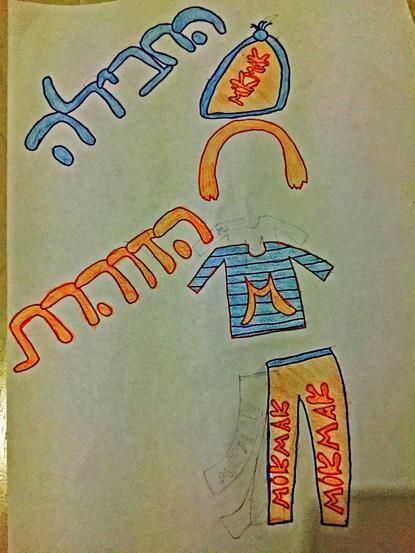 ציירתי פריטים שהם: כובע מיקמק זוהר, שיער כתום זוהר, חולצת מיקמק זוהרת ומכנס מיקמק זוהר