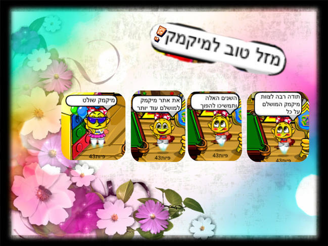 ממש יפה כל הכבוד פיות43 ובאמת מזל טוב למיקמק וגם יום הולדת שמח |