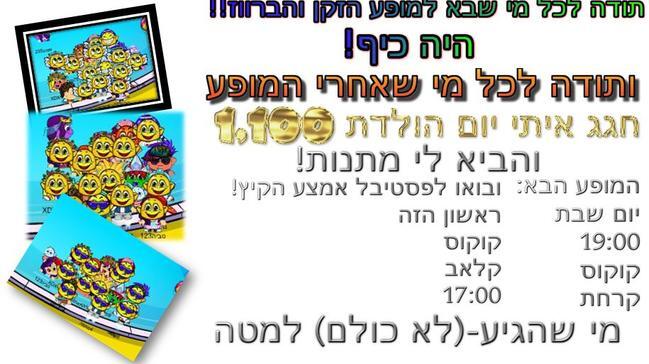 היה כיף! בהתחלה ראינו את המופע המצחיק והבאנו מהקהל אנשים ששיחקו ואילתרו ואחרי זה חגגנו לי יום הולדת 1,100!! מי שבא: zamz, נוביה123, ורודי4440, 4מתמה, סינימיני12, ori1204, אמיליXDX, נויהחמודה, יוקלה, טלי, מימי040- סליחה אם שכחתי מישהו! _________________________________ המופע הבא: קוקוס שבת הזאת 17:00 קרחת __________________________________ בואו לפסטיבל הקיץ שלנו עם מופע של "חולמת" דביר542 יספר לנו על "מי רוצה להיות גיבור על?!", מופע פעלולים וחלוקת עיצובים. יהיה כיף! קוקוס ראשון הזה 2 לאוגוסט קלאב 17:00 יום טוב! |