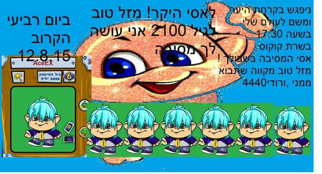יומולדת שמח אסי! נחגוג לך מחר בשרת קוקוס בשעה 17:30 בקרחת היער ואז לעולם שלי נחכה למאחרים מקווה שתבוא אסי! ממני ,ורודי4440