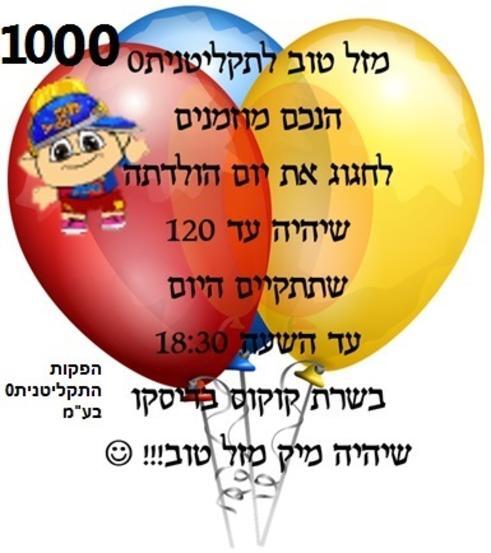 איזה כיף אני בת 1000 בואו לחנות הקסמים בקוקוס ותחגגו איתי ביחד ליאת והדס מוזמנות וכל המעריצים והמעריצות שלי!!! כולל: נועםאלימל1 הזמרת890 נוני5059 מינימאוס68 בואו יש עוד מליון חברים אז בואו!!! איזה כיף בסוכות אני בגיל 1000 בואו ולא לשכוח (להביא מתנות!)