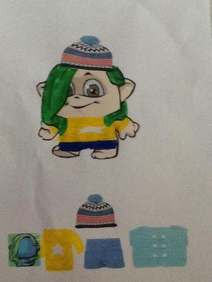 עיצבתי: שיער שרית ירוק, סוודר צהוב, סוודר תורקיז, מכנס ג׳ינס וכובע
