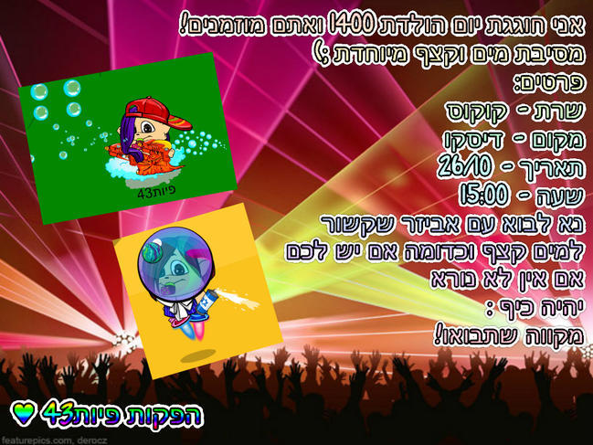 עכשיו המסיבה! בואו אני מזכיר למי שיש להביא פריט של ממש בואו ממש כיף שם אם אתם לא רוצים לפספס כי מעלים שם מלא תמונות לקהילה ואולי ליוטיוב אתם תיהיו מפורסמים כדא לבוא!!! בואו עכשיו לקוקוס בדיסקו לפני שיגמר! |