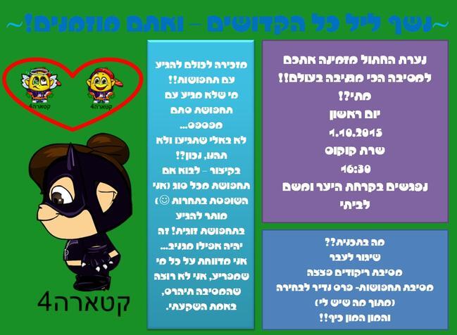 אוקיי, אז ככה- אני עושה נשף ליל כל הקדושים :) מאוד השקעתי! הנשף יתקיים ביום ראשון 1.11.2015 בשרת קוקוס קרחת היער, ומשם לביתי. מקווה שתבואו, קטארה.
