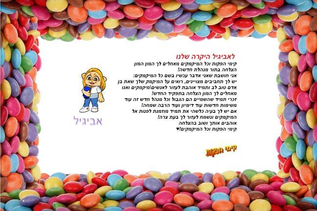 לקימי אהבתי את הברכה בהצלחה היא היתה מאוד מרגשת ולאביגל אני מאכלת לך בהצלחה אני מיקמקית די וטיקה ומאוד אשמח ליפגוש אותך בעתיד