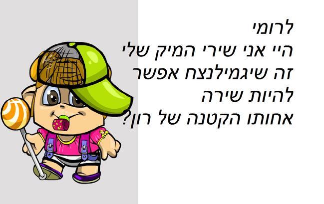 ל139רומי אני יכולה להיות שירה בבקשה תודה שירי (שיגמילנצח) יש לי ניסוין תכתבי בתגובות עם את מרשה