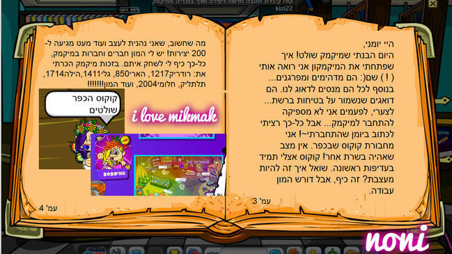 היי נוני, אחלה יומן, ואני רוצה לומר לך שאני איתך עמוד ליד עמוד במיקמקון במדור יצירות, והמקום שאני נמצאת בו במיקמק זה גם הכפר המהמם שלנו עם החבר'ה הכי טובים! כיף לי "לגור" איתך שם♥