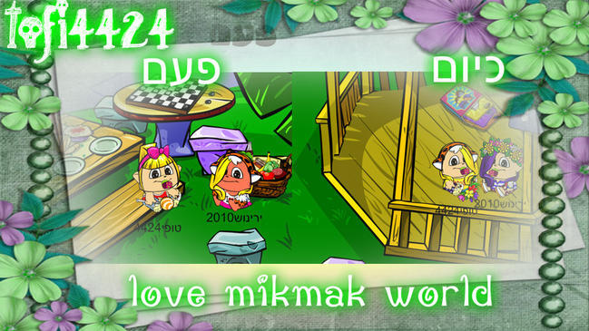 היי לכולם, קרה לי אתמול משהו מדהים ורציתי לספר לכם. אז כפי שאתם יודעים או לא יודעים אני מאוד ותיקה במיקמק, כשהייתי בת 100 יום במיקמק פגשתי בפארק הישן מיקמקית מאוד נחמדה, הצטלמנו ( התמונה של פעם שבתמונה) שיחקנו ונהנו וקבענו להיפגש יום למחרת. היא לא הגיעה. שכחתי ממנה והמשכתי הלאה. אתמול פגשתי את אותה המיקמקית, היא הייתה נראת לי מוכרת. אז שאלתי אותה אני מכירה אותך מאיפה שהוא? לא יודעת איך, היא זכרה אותי. היא סיפרה לי חוויות של המיקמק שהיא עברה מאז. ונהינו חברות. האמת שזה סיפור מצחיק, בחיים לא הייתי מנחשת שאפגוש אותה שוב. טופי4424