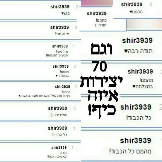 הייי! טוה, קודם כל נתחיל בזה ש- ת ו ד ה ר ב ה לshir3939 על כל התגובות הממקמות שהיא תמיד כותבת לי, תמיד מעודדת אותי וכל מה שרק צריך! בשבילי, למרות שאנחנו לא נפגשות, אנחנו חברות דרך הקהילה! וביחד עם זה- היצירה ה70 שליייי! איזה כיף! טוב צילמתי וערכתי את כל הבערך 15 תגובות (א. זה די הרבה בשבילי, ב.זה בערך, יש כמה שלא צירפתי לתמונה כי הם לא היו קשורות כל כך) אז תודה לכולם, אל העידוד הערצה השמחה ופשוט ה כ ל! רק בזכותכם הגעתי למספר יצירות שכזה!