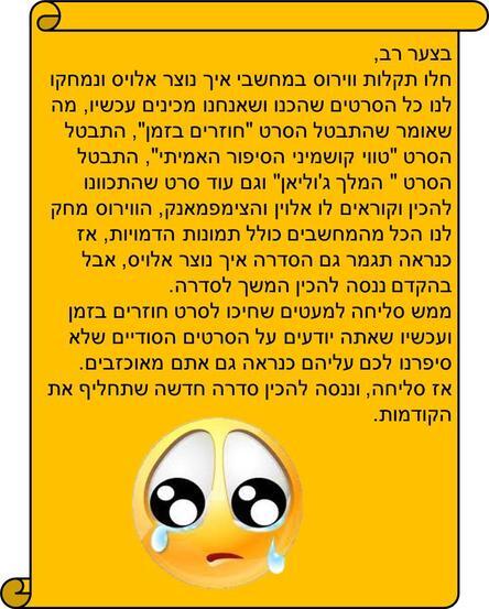 חלו תקלות במחשבי איך נוצר אלויס ונמחקו לנו כל הסרטים שהכנו ושאנחנו מכינים עכשיו, מה שאומר שהתבטל הסרט "חוזרים בזמן", התבטל הסרט "טווי קושמיני הסיפור האמיתי", התבטל הסרט " המלך ג'וליאן" וגם עוד סרט שהתכוונו להכין וקוראים לו אלוין והצימפמאנק