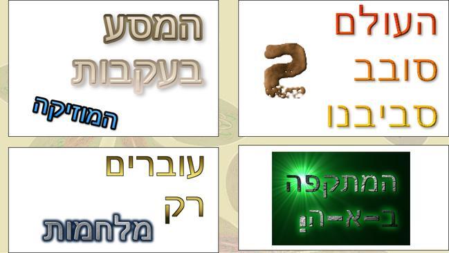 לפניכם מוצגים 4 אופציות: 1. העולם סובב סביבנו 2 2. המסע בעקבות המוזיקה 3. המתקפה ב-א-ה! 4. עוברים רק מלחמות