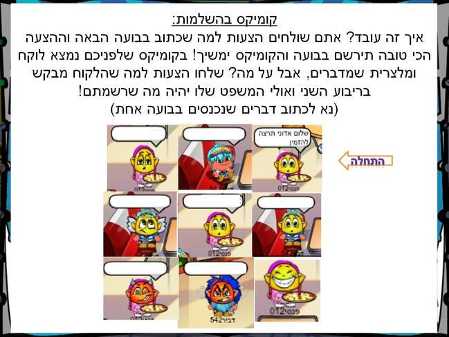 איך זה עובד? אתם שולחים הצעות למה שכתוב בבועה הבאה וההצעה הכי טובה תירשם בבועה והקומיקס ימשיך! בקומיקס שלפניכם נמצא לוקח ומלצרית שמדברים, אבל על מה? שלחו הצעות למה שהלקוח מבקש בריבוע השני ואולי המשפט שלו יהיה מה שרשמתם! (נא לכתוב דברים שנכנסים בבועה אחת) רוצים עדיין להרשם ל"מי רוצה להיות גיבור על?! עונה שנייה"? שלחו מצגת שמתארת את הגיבור שלכם, תקדישו אותה לי ואולי תזכו להשתתף בתוכנית!