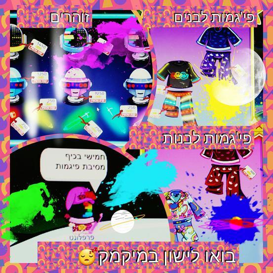 חמישי בכיף של מסיבת הפיג'מות ממש כיף ומדהים איזה מגניב זה נכון טוב אני ממש שמחה מחמישי בכיף הזה מקווה שאתם אוהבים אותו כמוני! יש קטלוגים שאני הראתי בתמונה והינה איפה הם נמצאים: 1. פיג'מות לבנים בגונגל 2. פיג'מות לבנות באי 3. זוהרים ביער ויש לי משהו סודי ביותר! למי שלא יודע איפה שיש את הכדורגל יש כרית תילחצו עליה ואז אתם יכולים לזרוק כריות בעולם של מיקמק