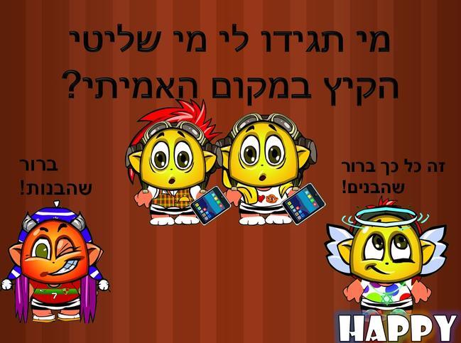 היוש השאלה שלי היום היא מי אתם חושבים שהיו שליטי הקיץ הבנים או הבנות תיכתבו בתגובות מחר אני יבדוק כמה אמרו בנות וכמה בנים ואז אני יעשה עיצוב למנצחים לדוגמה הבנים מנצחים אז אני עושה להם עיצוב מה זה אומר שאני יחפש כמה מיקמקים בנים (בהפתעה) ואז אני יעשה עיצוב וככה אותו הדבר עם הבנות יאלה ביי ^-^