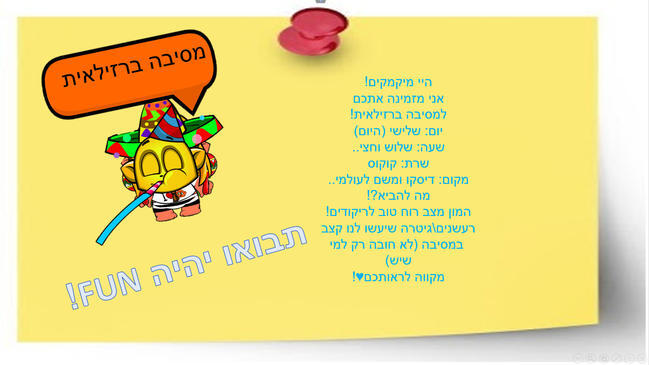 היי מיקמקים!אני מזמינה אתכם למסיבה ברזילאית! יום: שלישי (היום) שעה: שלוש וחצי.. שרת: קוקוס מקום: דיסקו ומשם לעולמי.. מה להביא?!המון מצב רוח טוב לריקודים!רעשנים\גיטרה שיעשו לנו קצב במסיבה (לא חובה רק למי שיש)מקווה לראותכם♥!