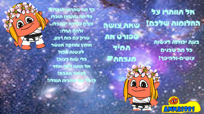 את קיצר כל מה שתרצו תוכלו! שוב נפל לי העכברXDXD טוב נו עכשיו ברצינות.. אז באמת כל מה שתירצו תוכלו! לא משנה איזה ענף ספורט תירצו לבחור!אתם יכולים להצליח בהכול! עכשיו נפל לי הספר שלי..XD מה קורה לי היום?! טוב אז כמו שאמרתי-כל מה שתבחרו-הכל בידיים שלכם. אתם יכולים להחליט מה לעשות עם זה,לאן אתם רוצים להגיע.. אף אחד לא יכול לעשות את זה בשבילכם! אתם האדם היחיד שיחול לכולם פה שינוי בעצמכם! "~ANNA1881~ הפקות ועיצובים"מאחלת לכם יום טוב חופש כיף וכמובן הצלחה לישראל באולימפיאדה♥