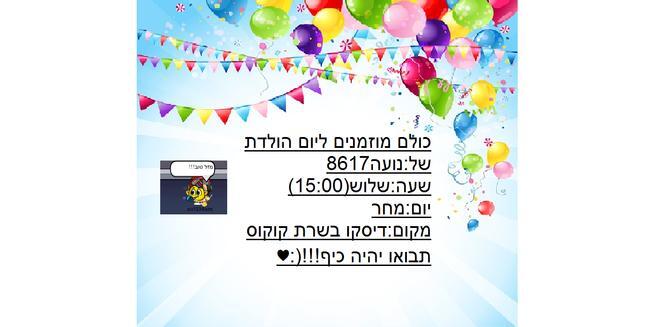 היי לכולם אז אני מזמין אתכם מחר ליום הולדת של נועה8617 יהיה כיף יום: מחר, שעה: שלוש