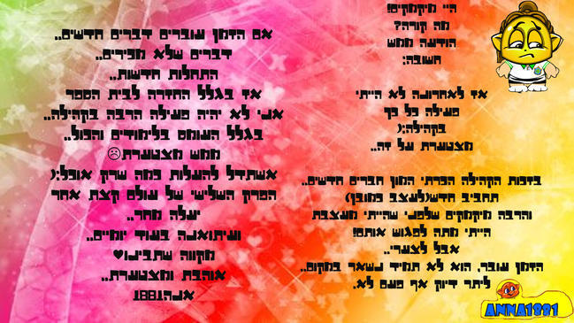 בזכות הקהילה הכרתי המון חברים חדשים.. תחביב חדש(לעצב כמובן)והרבה מיקמקים שלפני שהייתי מעצבת הייתי מתה לפגוש אותם! אבל לצערי.. הזמן עובר, הוא לא תמיד נשאר במקום.. ליתר דיוק אף פעם לא. אם הזמן עוברים דברים חדשים.. דברים שלא מכירים.. התחלות חדשות.. אז בגלל החזרה לבית הספר אני לא יהיה פעילה הרבה בקהילה.. בגלל העומס בלימודים והכול.. ממש מצטערתאשתדל להעלות כמה שרק אוכל:( הפרק השלישי של עולם קצת אחר יעלה מחר.. ועיתואנה בעוד יומיים.. מקווה שתבינו♥ אוהבת ומצטערת.. אנה1881 ודרך אגב,גם נוי שביקשה עיצוב תקבל.. כל מי שביקש יקבל.. "~ANNA1881~ הפקות ועיצובים" מאחלת לכם יום טוב ובהצלחה בלימודים♥