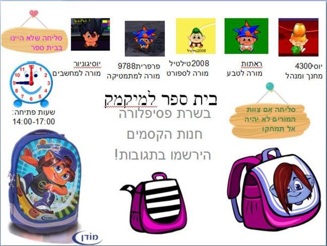 אוקיי כל הזמן חשבתי על להעלות את זה, ועכשיו אני מעלה. אז יופי, כפי שאתם רואים הצטרפו אלינו שני מורים חדשים. פרפרית9788 מורה למתמטיקה ראתות מורה לטבע אני גם המנהל אז אני אכתוב את שמות המורים הקודמים: יוסי4300 2008טילטיל יוסיגוניור והזוכים שנרשמו בהרשמה המוקדמת זוכים בעיצוב חגי תשרי הזוכים הם: נויוהדר 333מתוקי3 ברביעדי גשו לכיתה וקבלו את העיצוב ההרשמה המקורית החלה!