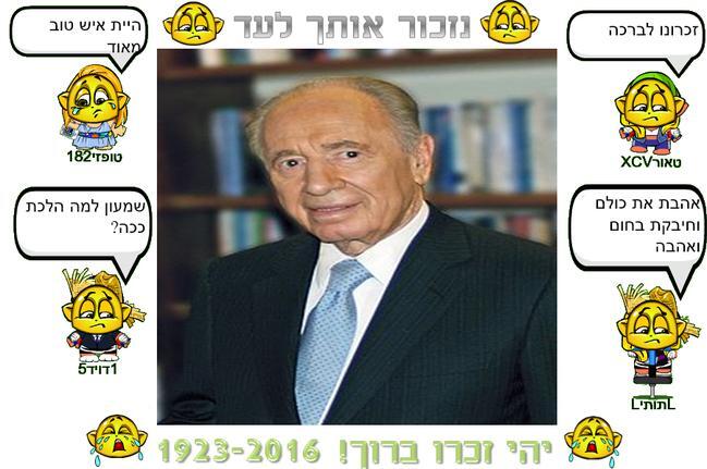 שלום לכולם, למי שלא ידע - ביום רביעי בשעה 00:59 לפנות בוקר שמעון פרס נפטר. הוא היה בן אדם טוב, בן אדם שרדף שלום, הוא היה גיבור! שמעון פרס זכה בפרס נובל לשלום והיה ראש הממשלה ה7 של ישראל. לפי דעתי שמעון חי חיים מלאים, הוא זכה לראות את הטוב והרע בעולם. משפחת פרס, תהיו חזקים :(( שמעון פרס היה אדם שראוי להערכה הוא היה בן אדם טוב וחזק, לא הרבה מצליחים להגיע לגיל 93.. זה מאוד עצוב שהוא הלך ככה, קשה להיות בלעדיו, קשה שלוקחים רק את האנשים הטובים :( תודה לכל מי שעזר לי לצלם את התמונה, המשך יום טוב♥ ~1923-2016~