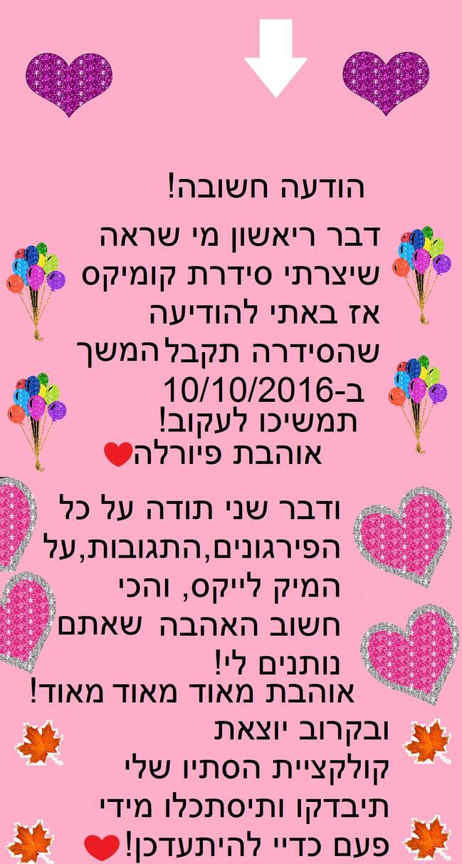 היי מיקמקים אשמח אם תיקראו את ההודעה החשובה הזאת אני יסביר לכם מה רשום בה בדרך המקוצרת... אז ככה דבר ריאשון מי שבדק במידה ואם לא להיסתכל. אז לסידרה שהכנתי תיהיה המשכיות בעוד יומיים! דבר שני רציתי להודות לכל המיקמקים שמפרגנים לי ונותנים לי מיק לייקס וגם בקרוב אני יוציא את קולקצית הסתיו תיכנסו לקהילה שלי מידי פעם כדיי להיתעדכן! אם תיקראו את ההודעה תבינו יותר אשמח אם תגיבו ותיתנו לייקים שלכם פיורלה ושוב תודה רבה על כל המיק לייקס והפירגונים.