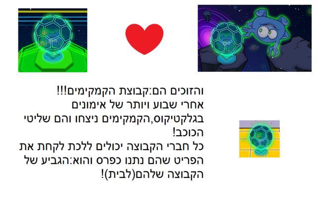 היי לכולם! מקוה שכולכם התחדשתם בפריט החדש לבית והוא:גביע של קבוצת הקמקימים! אני הייתי בקבוצה הזאת ואני זכיתי! כל הכבוד לכולם גם לחברי הקבוצה השנייה שהתאמצו בשביל המיקלופים והקמקימים כדי לדעת מי מביניהם הולכים להיות שליטי הכוכב! אז מקווה שאהבתם וכל הכבוד לכולם!!