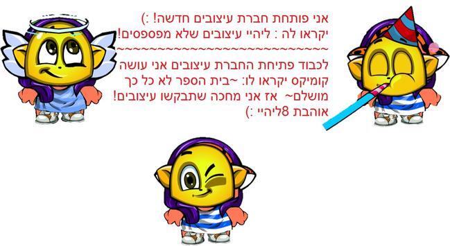 אז מישרוצה להשתתף בקומקיס שיבוא עכשיו לקוקוס חנות קסמים אני עושה אודישנים! בקיצר מסופר על ילדה שלא אוהבת את בית הספר ושכל פעם שמעבירים אותה מקום היא מתנהגת עוד יותר נורא ואחרי כמה שבועות ברחה מבית הספר..... והתלמידה המקובלת מתחילה לצחוק עליה וכך גם מעצבנת יותר את הילדה רוצים לדעת עוד? חכו לקומיקס ואם תרצו תוכלו להשתתף! וככה השחקנים הם (כאילו השמות): התלמידה שלא אוהבת את בית הספר- רומי (שעליה בעצם מסופר הקומיקס) המורה- אילנית התלמידה המקובלת- גל אבא של רומי- רון אמא של רומי- דנה התלמיד המקובל- דן החברה של רומי- מאיה שחקנים אורחים (הם לא יהיו בכל הקומקיס יהיו רק שלושה פעמים או פעמיים): סבתא של רומי- יעל אישה שמצאה את רומי- נונה בנתיים אני משחקת את התלימדה שברחה מבית הספר (רומי). אז ניפגש בקוקוס חנות קסמים! |