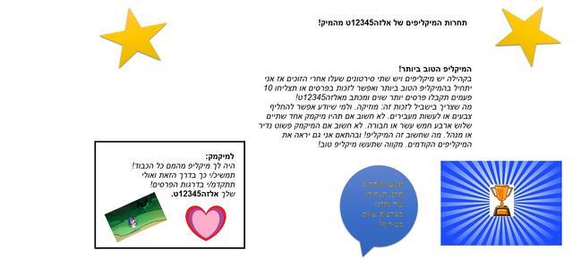 תחרות המיקליפים שאפשר להשיג בכל סיבוב נקודה ואפשר לקבל פרס יותר שווה אז כדי לכם לעשות מיקליפ? בחירה שלכם לדעתי כדי מאוד תקבלו פרסים שווים ומכתב אז כדי לכם לנסות!