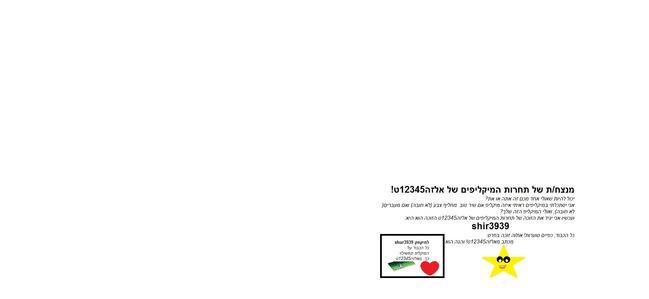 אם לא רואים כל כך טוב זה בגלל שהיתה בעיה אני יכתוב פה. מנצח/ת של תחרות המיקליפים של אלזה12345ט יכול להיות שאולי אחד מכם זה אתה או את? אני יסתכלתי במיקליפים וראיתי מיקליפ אם שיר טוב, מחליף צבעים, (לא חובה), ואם מעברים, (לא חובה). ואולי המיקליפ הזה שלך? ועכשיו אני יגיד את הזוכה של תחרות המיקליפ של אלזה12345ט. הזוכה הוא היא: shir3939 כל הכבוד כפיים סוערות! את/ה זוכה בפרס מכתב מאלזה12345ט והנה הוא. למיקמק shir3939 כל הכבוד על המיקליפ תמשיכ/י כך. מאלזה12345ט. (בתמונה יש תמונה קטנה זאת אלזה12345ט רק שתדעו) (נכון הכוכב חמודי, לא? תגיבו בתגובות.