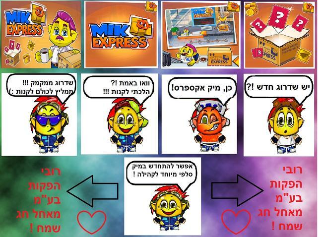 שלום לכל המיקמקים ! לפני כמה ימים צוות מיקמק הכין בשבילנו שדרוג מיק מגניבנ שבכל יום שלישי נקבל נקודות הישגים/כסף/פריט לבוש. אני ממליץ מאוד לחבר שלי יש את השדרוג החדש והוא יכול לצלם אם המוט סלפי דברים לקהילה סלפים וכו... ממליץ בחום לכולם ^_^ (אני אולי קונה) יום מוצלח לכולם. ~אוהב רובי הפקות בע"מ~ *מקווה תמונת היום*