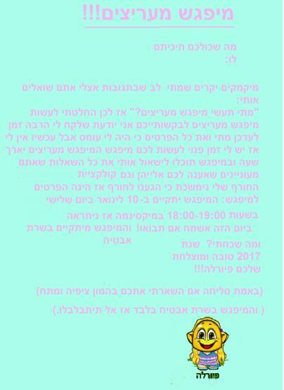 היי מיקמקים אם תיקראו את המיכתב תיראו את כל הפרטים למיפגש מעריצים שלי ולעידכון קצרצר ואם זה לא מספיק גדול כנסו לזכוכית המגדלת למטה ותגדילו ותיראו יותר טוב אשמח אם תבואו למיפגש שהוא ממש בקרוב שלכם פיורלה!!! (והפעם אני ערכתי את הצבעים לרקע ולכתב מקווה שאהבתם את עריכת הצבעים.)