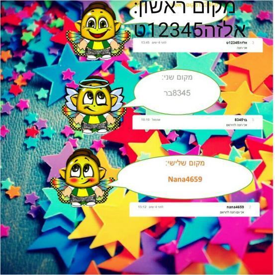 והנה הזוכים! מקום ראשון:אלזה12345ט שזוכה בשלוש עיצובים ושלוש הקדשות ליצירות הבאות! מקום שני:בר8345 שזוכה בשני עיצובים ושתי הקדשות ליצירות הבאות! מקום שלישי:nana4659 שזוכה בעיצוב אחד והקדשה ליצירה הבאה! בבקשה תעלו תמונה שלכם לקהילה ותקדישו לי כדי שהעשה ממנה עיצוב. סליחה שהאותיות של מקום ראשון בתמונה מודגשות, פשוט האמיתיות נמחקו לי. מזל טוב לזוכים! לא נורא למי שהפסיד!