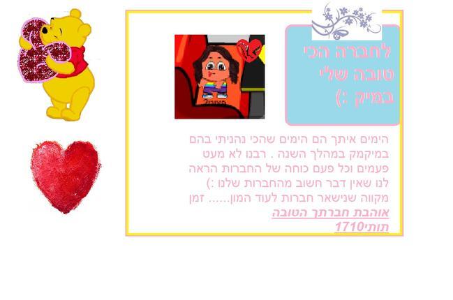 אז יש לי חברה הכי טובה במיקמק כבר שבועיים או שלוש אנחנו נפגשות ברצף :) שאני איתה אני מרגישה שאני פשוט אני , כיף לי להיות איתה ואני בטוחה שגם כיף לה :)