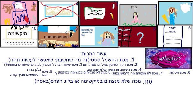 המכות: 1.חשמל סטטי. 2.מכת קור-כשאין לך מעל או משהו אתה קופא. 3.שיעורי בית לחופש-חופש רוצים להנות. 4.כשהציור לא יוצא טוב. 5.בלגן בחדר. 6.מטלות-למה???? 7.לא למצוא מה ללבוש-בנות יבינו. 8.לא מצליחים במשימה של מיקמק. 9.כשמשהו מביך קורה לך-כמו בכיתה וכאלה. 10.כשלא מנצחים במיקשימה-ואני מקווה שזה לא יקרה לי. אז כתבתי מכות מצחיקות שחלק יכולים להזדהות איתם חלק קשורות לעולם של מיקמק וחלק לא מקווה לזכות ושאהבתם ביי.