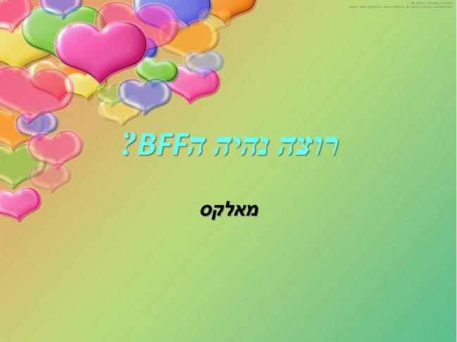 היי אז אשמח אם נהיה הBFF ואם כן אז אני יעשה יצירה(((((((((((: חחחח מקווה שתגידי כן וזהו ביי