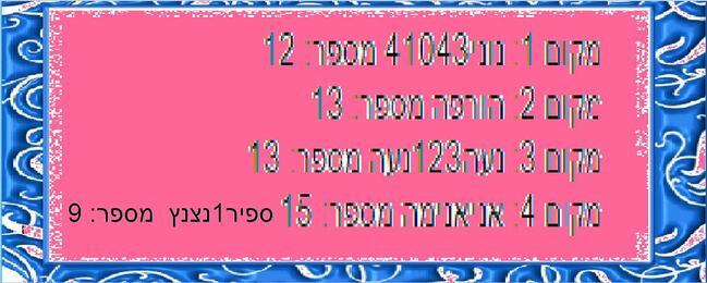 שלום חברים,מיקמקים,מנהלים ומעריצים, איך היה לכם אתמול ליל הסדר? נחמד, הא? מי מצא את האפיקומן? מי ישב איתכם? ונעבור לנושא הבא... "עוד זוכה במקום הרביעי בהגרלה!" באצם, כמה ימים אחרי שכתבתי את הזוכים,שמתי-♥ שהמספר 15 והמספר 9,קרובים למספר 12 באותה המידה, אז זה לא יהיה הוגן לא להוסיף את ספיר (ה-B.F.F שלי, הבוטן שלי, היא החברה הכי טובה שלי באמיתי!) אז יש לנו 2 זוכות במקום הרביעי, מזלט! הן זוכות באותו הפרס, כמובן.